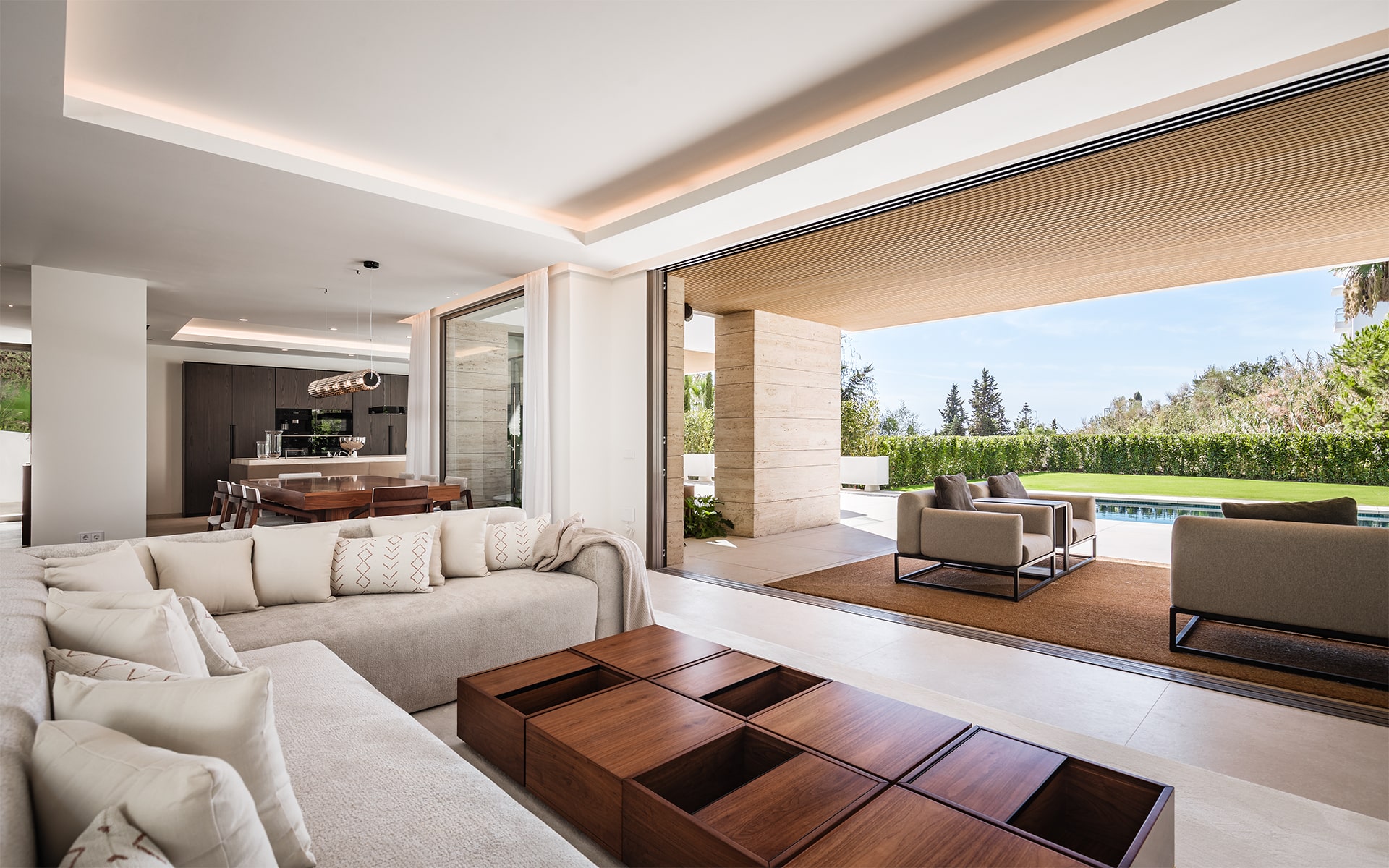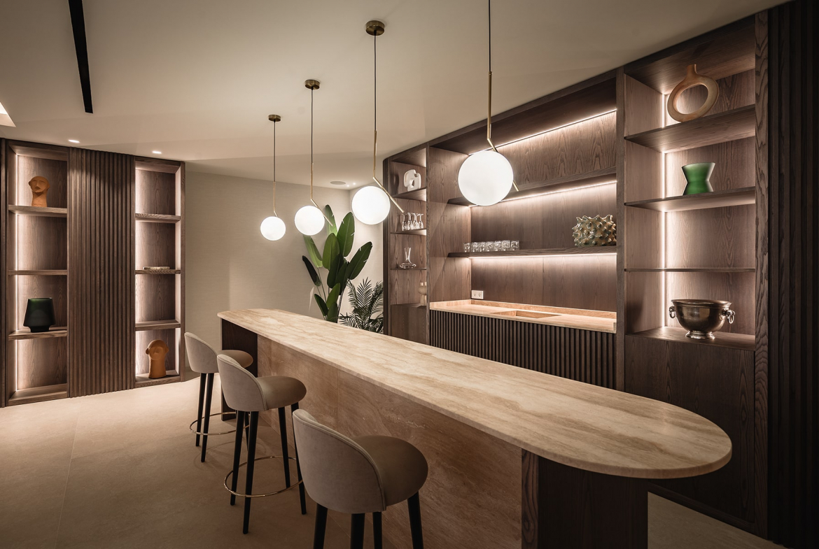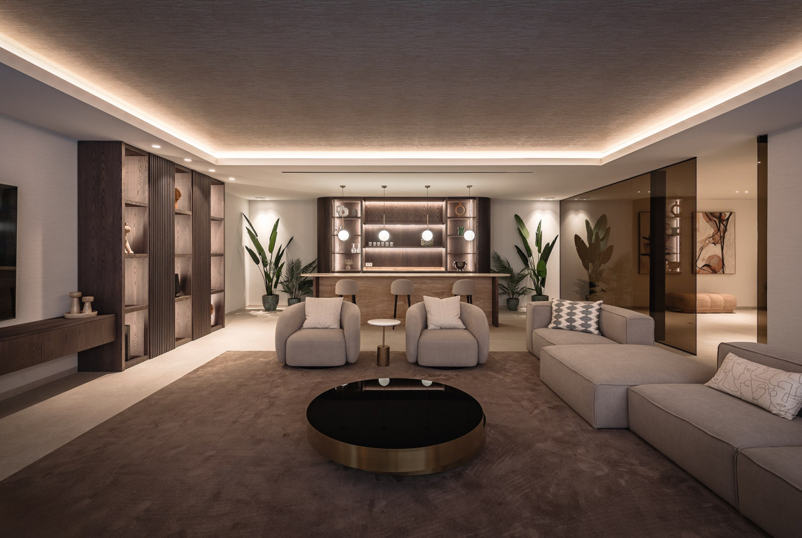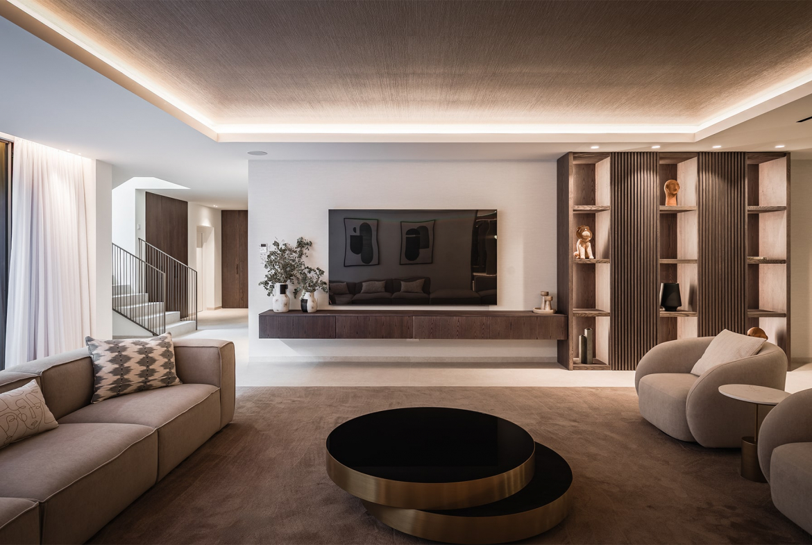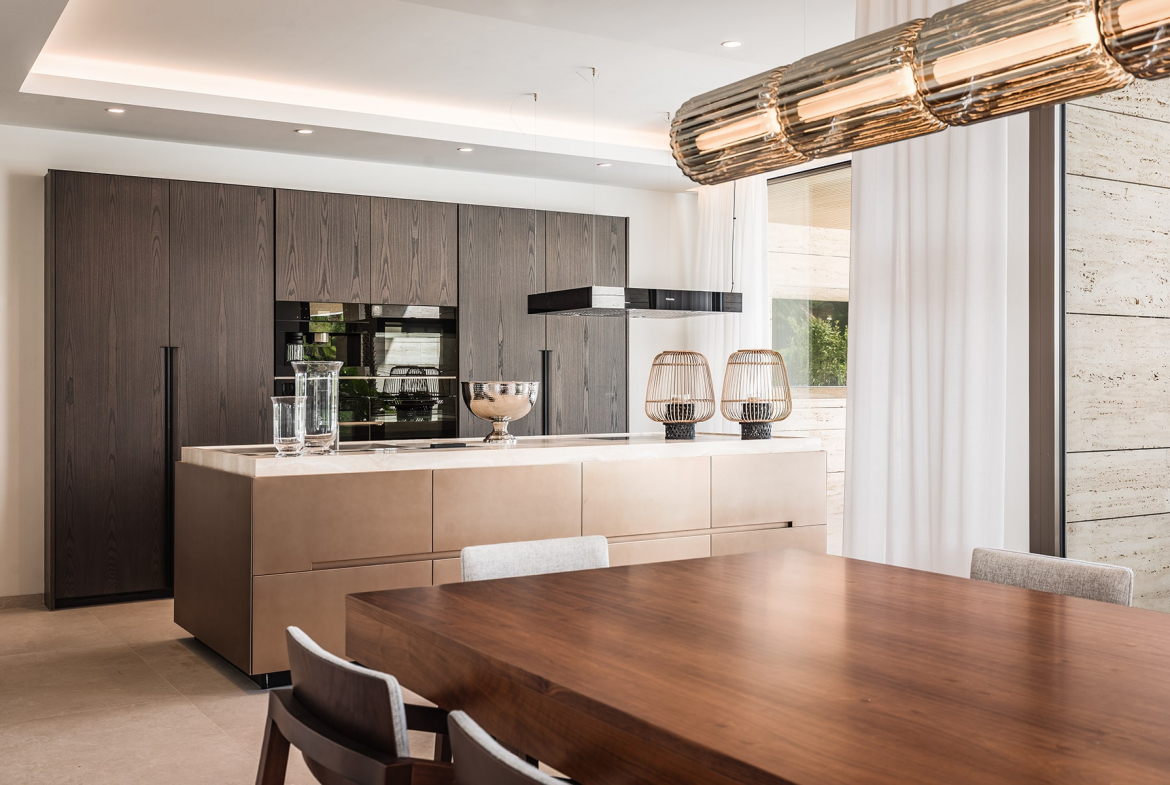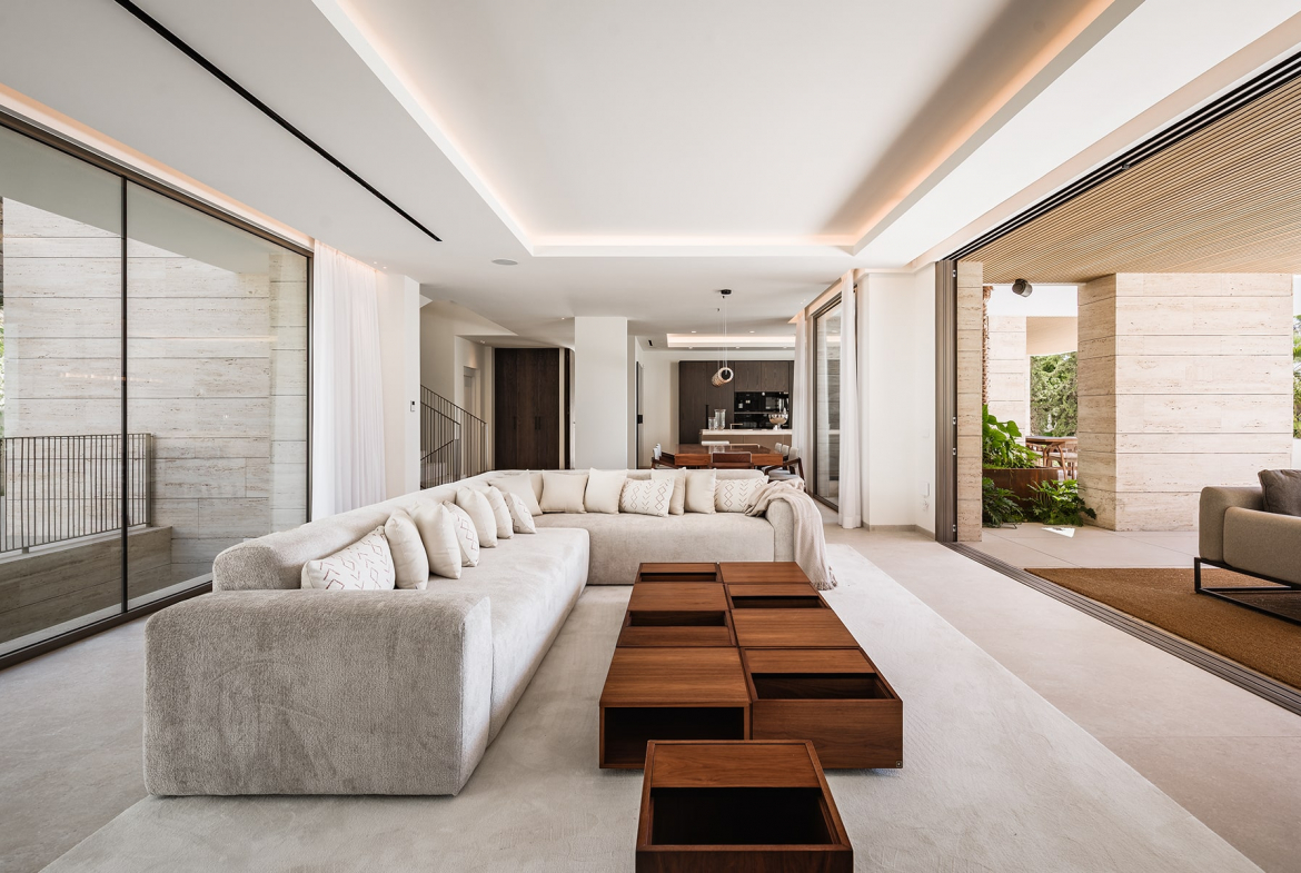 The villa’s architecture combines clean lines and elegant materials with exceptional functionality. Inside, bright open spaces flow seamlessly, featuring a designer kitchen, spacious living and dining areas, and floor-to-ceiling windows that fill the home with natural light.