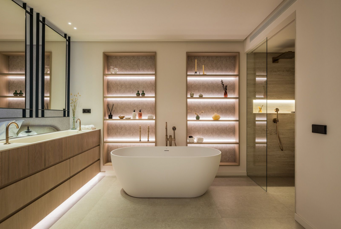 The pool area and terrace offer several lounge areas and water features nicely connected with the pool. Here is also a buggy garage with direct access to the golf course. The roof terrace is every entertainers dream. Here you will find the outdoor kitchen, seating and dining areas, outdoor cinema and the villas second pool.