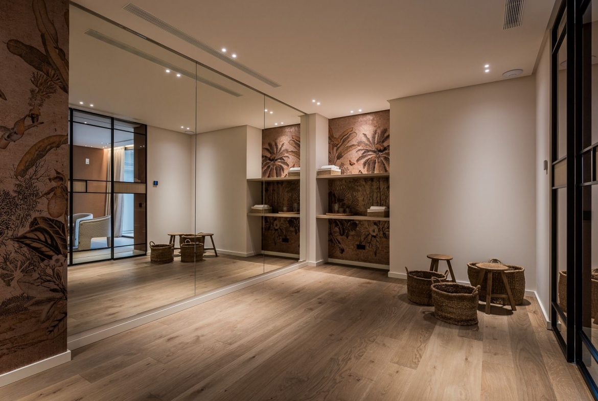 All offering amazing views over the golf course and valley. In the basement there is a gym dressed in dark wooden walls and ceiling as well as the home office.