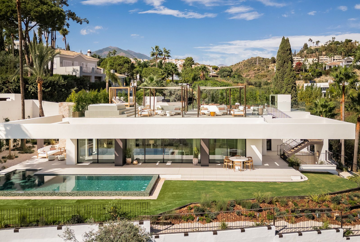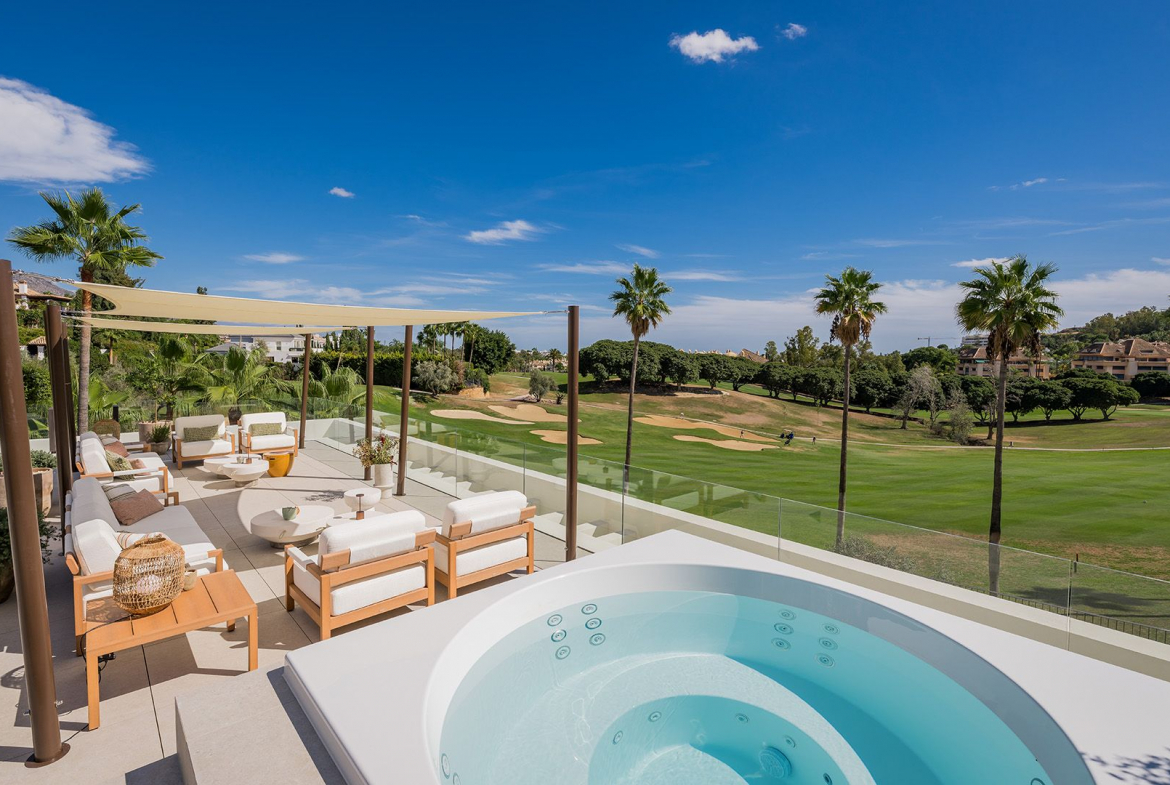 Stepping into Casa Tesalia you are welcomed by a modern and sleek living space with a nice design kitchen in an open plan to the dining and living room. Through the large floor to ceiling glass doors, you will get an amazing view over the golf course of Los Naranjos. Furthermore, on this level there is 4 bedrooms, all en-suite and with its own terrace. The master bedroom with its almost 40 m2 includes a walk-in closet and designer bathroom in an open plan to create that luxurious suite feeling.