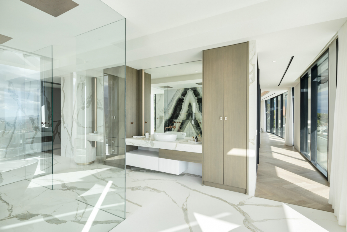 From the moment you enter, you’re greeted by double-height ceilings, cascading water features, and a state-of-the-art gourmet kitchen — all designed to impress. The villa’s master bathroom, styled by a renowned fashion designer, reflects unparalleled attention to detail and elegance.