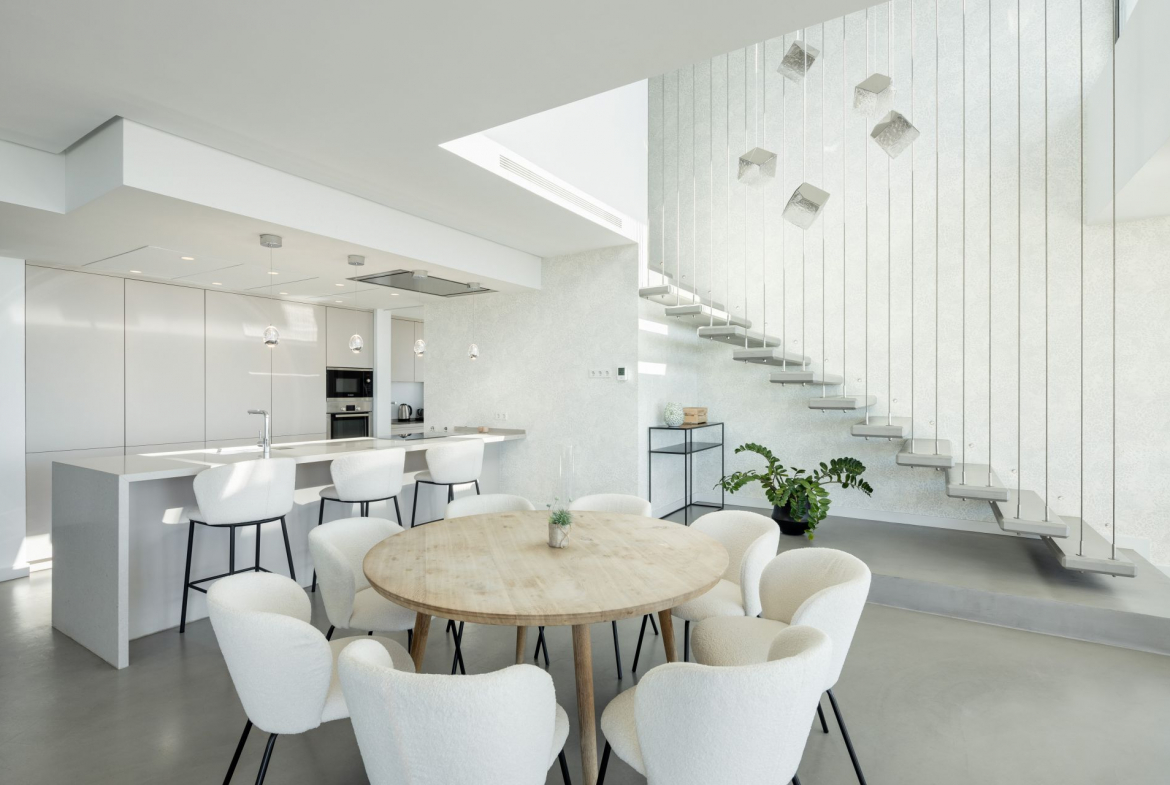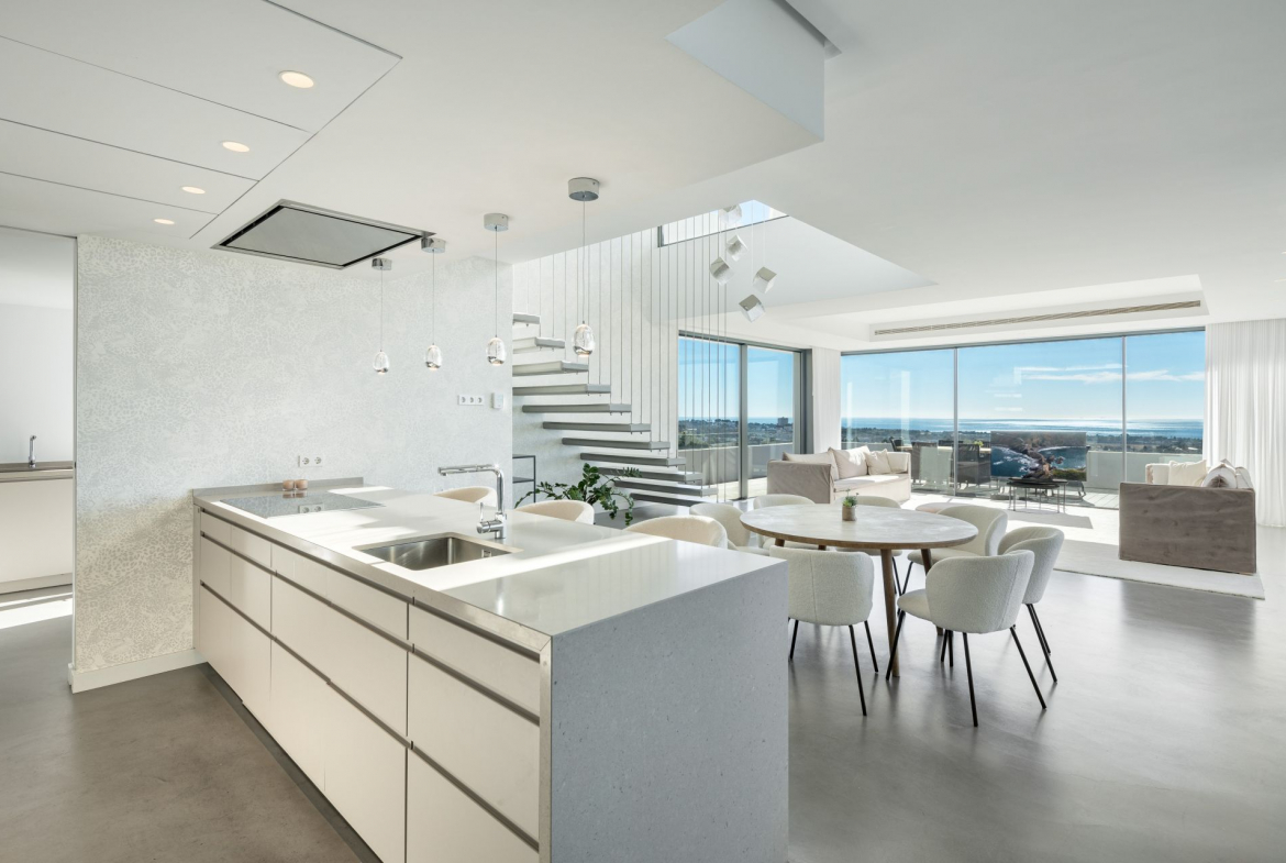 The interior offers a stunning open-plan layout, allowing for a seamless flow between living spaces. Floor to ceiling glass sliding doors open up to the exterior terraces, maximising indoor/outdoor living as well as providing incredible views from the interior. The modern kitchen comes fully-equipped with state-of-the-art kitchen appliances and plenty of storage, making the space functional and aesthetic.