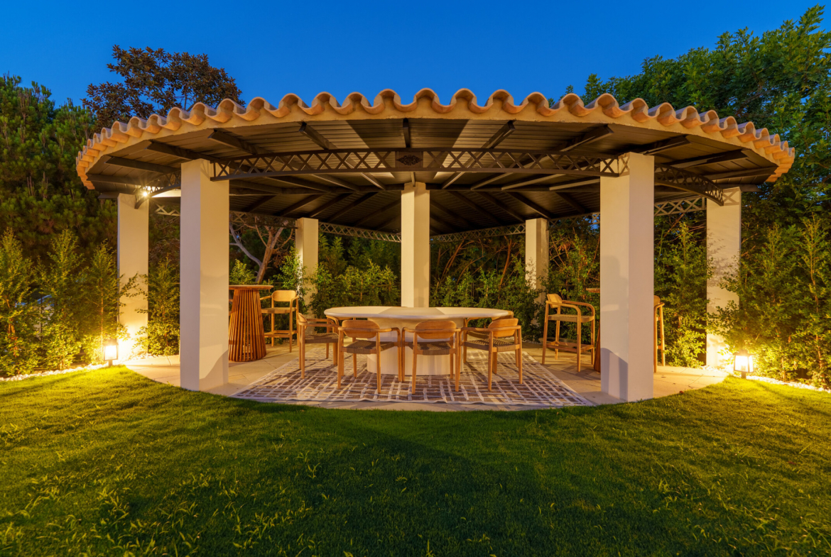 The outdoor spaces are nothing short of spectacular. Beautifully landscaped gardens surround a private swimming pool, complemented by a sunken lounge with ambient lighting and multiple shaded dining and relaxation areas. From sunrise breakfasts overlooking the sea to evening cocktails framed by mountain silhouettes, every moment here is elevated by the breathtaking surroundings.