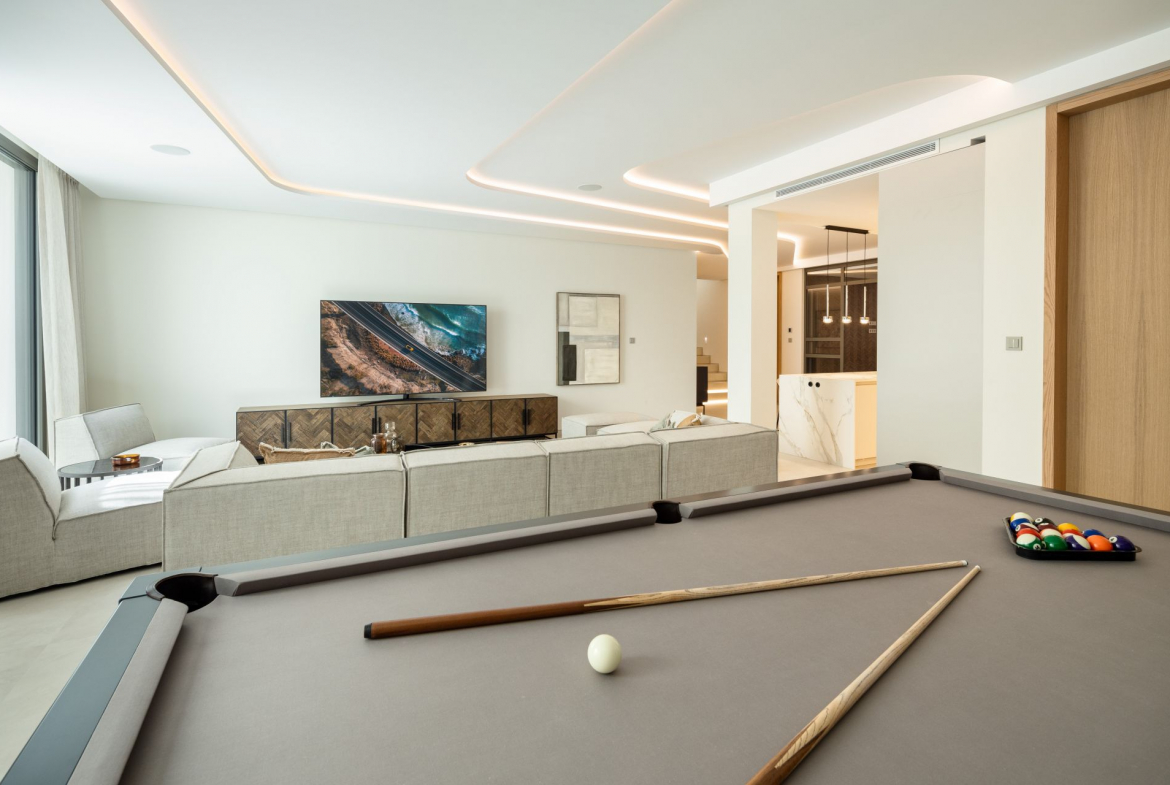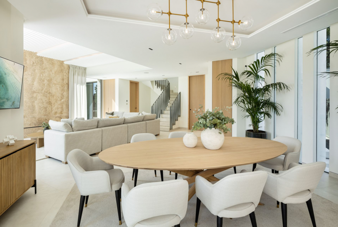 Upon entering, the villa reveals an inviting atmosphere where warm tones and elegant finishes blend seamlessly. The large archway and lead lights create a sense of grandeur, while wooden doors add rustic charm. The main living area is both functional and aesthetically pleasing, with an open-plan layout maximising space and light. Hidden warm LED lighting adds a cosy ambiance, and high windows frame breathtaking views of La Concha mountain, the golf course, and a serene lake with a fountain.