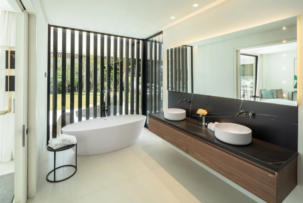 The interior boasts an open-plan design with a bright living room, dining area, and a fully equipped modern kitchen with high-end appliances. The villa offers five well-sized bedrooms, including a large master suite with a walk-in wardrobe and an en-suite bathroom with premium finishes. Floor-to-ceiling windows throughout the home create a seamless flow between indoor and outdoor living spaces.